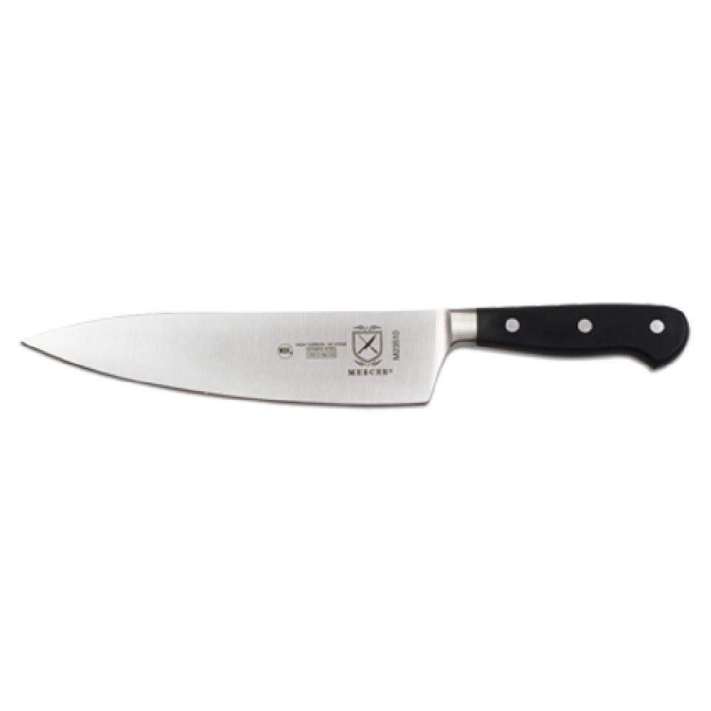 The JB Prince Z196 8 Mercer Renaissance Chef's Knife - 8" Forged is a high-performance culinary tool designed for professionals and cooking enthusiasts who demand precision and durability. Engineered with high carbon stainless steel, this 8-inch forged chef's knife ensures exceptional sharpness and edge retention, making it an indispensable tool in any kitchen. The blade's robust construction provides superior strength, allowing for effortless slicing, dicing, and chopping of a variety of ingredients. The knife features a POM (Polyoxymethylene) handle, known for its strength and resistance to fading and discoloration, offering a comfortable and secure grip during prolonged use. Its elegant black finish complements the sleek and professional aesthetic, making it a striking addition to any culinary arsenal. This knife is perfectly balanced, enhancing control and reducing fatigue during extensive food preparation tasks. The JB Prince Z196 8 Mercer Renaissance Chef's Knife is meticulously crafted to meet the high standards of chefs in fine dining restaurants, catering services, and professional culinary schools, while also appealing to home cooks who prioritize quality and craftsmanship in their kitchen tools. Its combination of advanced materials and thoughtful design positions it as a versatile and essential knife for a wide range of culinary applications.