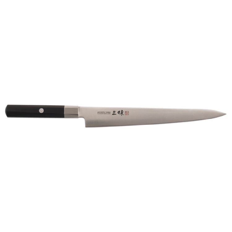 The JB Prince Z234 Mcusta Zanmai Sujihiki Slicer 9-4/5" Forged is a high-performance kitchen tool, meticulously designed for precision and efficiency. This slicer features a 9-4/5 inch blade crafted from VG-10 high carbon stainless steel, known for its exceptional strength, sharpness, and corrosion resistance, making it a preferred choice for professional chefs and culinary enthusiasts. The knife's smooth edge is designed for precision slicing, ideal for achieving clean, even cuts, particularly in meats and fish. The blade is expertly forged, ensuring optimal balance and control during use. The handle is made from high-quality wood, finished in black, providing a comfortable grip and adding a touch of elegance to the design. Made in Japan, this slicer embodies the renowned craftsmanship and attention to detail associated with Japanese cutlery. Its robust design and superior materials make it suitable for a variety of culinary applications, catering to both commercial kitchens and home cooks who value quality and performance. The JB Prince Z234 Mcusta Zanmai Sujihiki Slicer is a reliable and durable option, combining traditional craftsmanship with modern technology to deliver a superior slicing experience across diverse culinary settings.