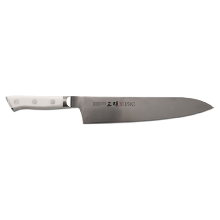 The JB Prince Z239 10 Mcusta Zanmai Pro Gyuto Chef Knife 9-2/5" Forged is a premium kitchen tool designed for precision and durability, making it a standout choice in the culinary world. Crafted in Japan, this chef knife features a forged blade composed of molybdenum/vanadium steel, renowned for its exceptional sharpness and edge retention, catering to professional chefs and culinary enthusiasts alike. The 9-2/5" blade length provides a versatile cutting experience, ideal for a wide range of kitchen tasks, from finely dicing vegetables to slicing meats with ease. Complementing the blade's superior quality are the Dupont Corian handles in a sleek white finish, offering a comfortable grip and exceptional durability, even in the most demanding kitchen environments. This combination of high-grade materials ensures both performance and aesthetic appeal, making the JB Prince Z239 10 knife a valuable asset in professional kitchens, household kitchens, and culinary schools. Its design caters specifically to those valuing precision and reliability in their kitchen tools, embodying a perfect blend of traditional craftsmanship and modern technology. The JB Prince Z239 10 Mcusta Zanmai Pro Gyuto Chef Knife is a testament to Japanese knife-making expertise, delivering consistent performance for a variety of culinary needs.