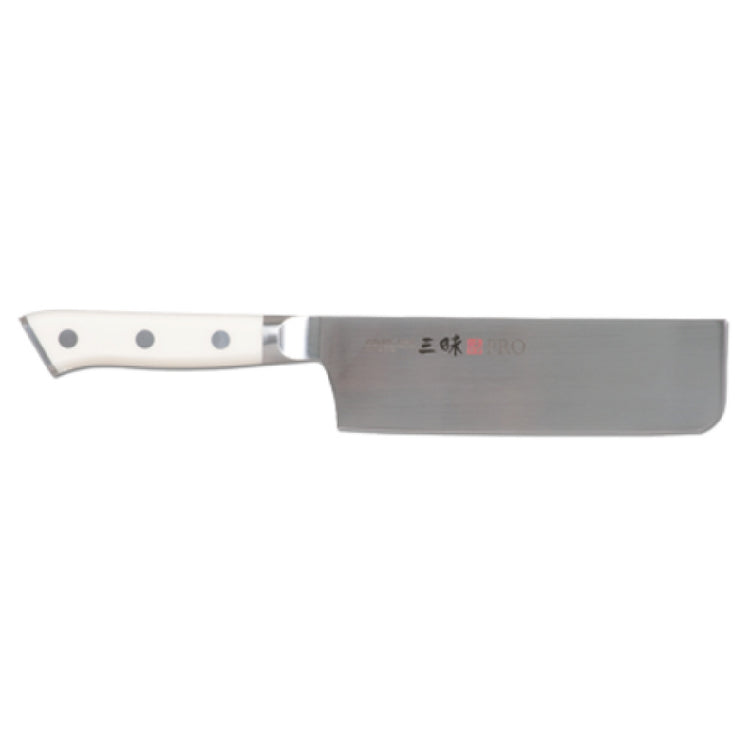 The JB Prince Z240 Mcusta Zanmai Pro Nakiri Knife 6-1/2" Blade (165mm) Forged is a precision-crafted kitchen tool, skillfully forged to meet the discerning needs of culinary professionals and enthusiasts alike. This knife features a 6-1/2 inch (165mm) blade constructed from a robust molybdenum/vanadium steel, renowned for its exceptional durability and ability to maintain a sharp edge, making it an ideal choice for repetitive slicing tasks. The blade's composition enhances its resistance to corrosion and wear, providing a long-lasting performance for both commercial and home kitchens. The handle is crafted from Dupont Corian in a striking white finish, offering a comfortable and hygienic grip that is easy to maintain. Made in Japan, this knife carries a legacy of impeccable craftsmanship and design, blending traditional techniques with modern materials to deliver a superior culinary tool. Whether you're a professional chef or a home cook, the JB Prince Z240 Mcusta Zanmai Pro Nakiri Knife is a valuable addition, offering precise control and a keen edge for slicing vegetables with ease and efficiency.