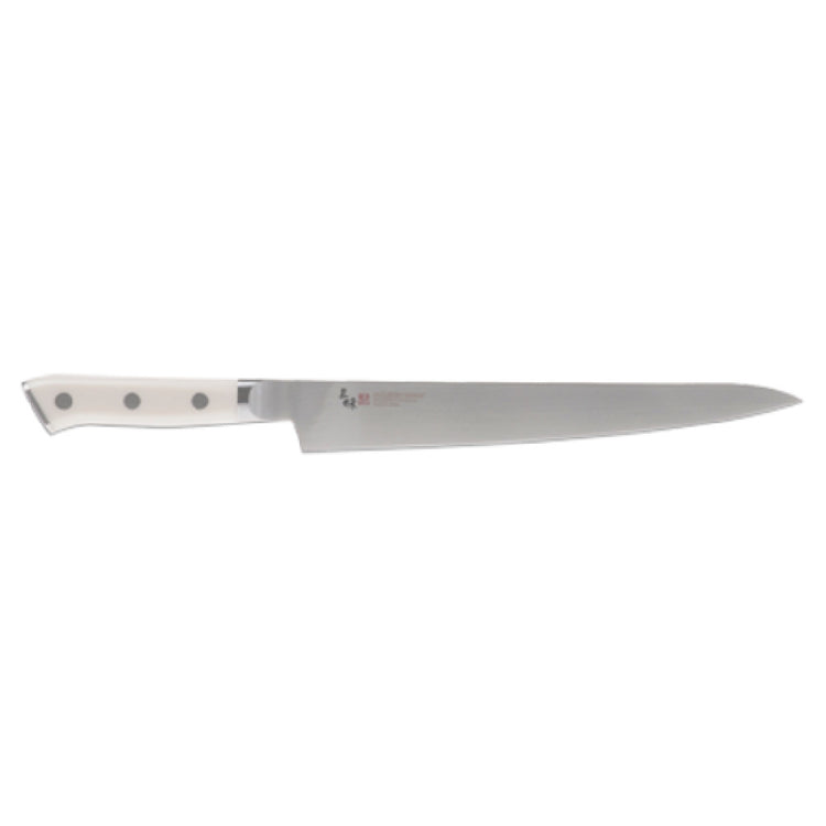 The JB Prince Z241 9 Mcusta Zanmai Pro Sujihiki Slicer 9-2/5" Forged exemplifies exceptional craftsmanship and precision in culinary tools. This slicer features a meticulously forged blade crafted from molybdenum-vanadium steel, offering superior sharpness and durability, ideal for precise slicing tasks. Its 9-2/5-inch blade length provides an optimal balance for control and efficiency in professional kitchens. The handle, made from Dupont Corian in white, ensures a comfortable and secure grip, enhancing user experience during extensive use. Manufactured in Japan, this slicer reflects the country's renowned tradition of producing high-quality cutlery. The JB Prince Z241 9 Mcusta Zanmai Pro Sujihiki Slicer stands as a preferred choice for culinary professionals seeking reliable, long-lasting performance. Its combination of modern materials and traditional forging techniques makes it uniquely valuable across different market segments within the food industry, from high-end restaurants to catering services. The specialized construction of the blade reduces friction, allowing for smooth and clean cuts, which is particularly beneficial for slicing meats and fish. This slicer is a testament to precision engineering, catering to the needs of chefs who demand excellence in their kitchen tools.