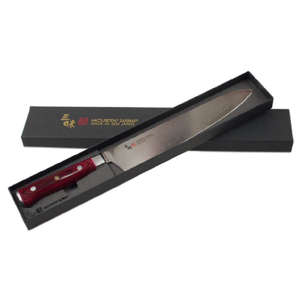 The JB Prince Z248 10 Mcusta Zanmai Damascus Flame Chef's Knife 9-2/5" Forged is a culinary masterpiece crafted for professional chefs and cooking enthusiasts alike. This premium knife features a blade made from VG-10 steel, renowned for its exceptional sharpness and durability, which ensures precision cutting and longevity. The 9-2/5 inch blade is forged, providing a robust and balanced feel, enhancing the user's control and efficiency during food preparation. The unique Damascus pattern on the blade not only adds an aesthetic appeal but also represents the high-quality craftsmanship that is synonymous with Japanese knife-making traditions. The handle, made from red pakka wood, offers both durability and a comfortable grip, reducing hand fatigue during extended use. Made in Japan, this chef's knife epitomizes the fusion of traditional techniques and modern design, making it an ideal choice for diverse market segments within the culinary industry, from upscale restaurants to home kitchens seeking superior performance and elegance in their cutlery. The JB Prince Z248 10 Mcusta Zanmai Damascus Flame Chef's Knife stands out as a symbol of excellence and a testament to the art of knife making, providing unmatched utility and style to its users.