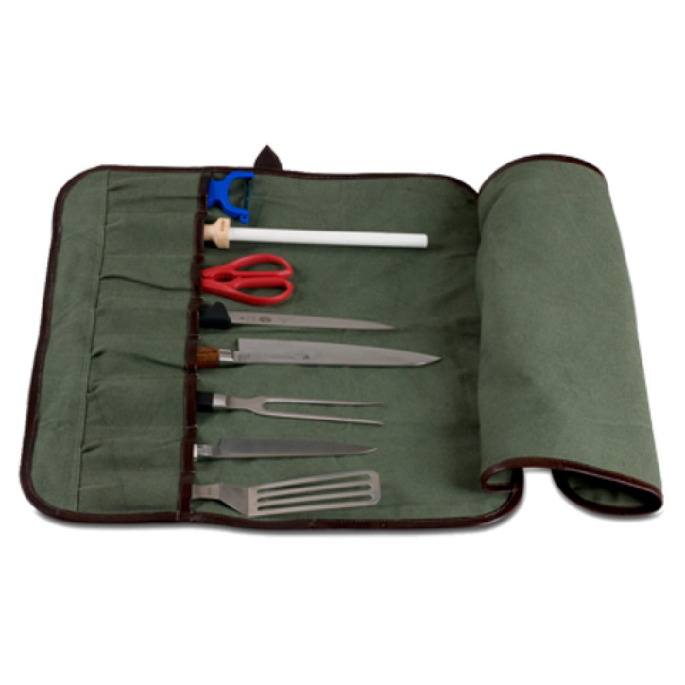 The JB Prince Z253 Boldric Knife Roll is a premium storage solution expertly designed for culinary professionals who value both functionality and style. This knife roll accommodates up to 8 essential kitchen tools, making it an ideal choice for chefs who require a compact yet versatile carrying option. Crafted with a luxurious brown leather exterior, it is paired with durable leather straps and elegant brass buckles that ensure secure closure and easy transport. Inside, the canvas liner provides added protection and a soft cushioning for your knives, safeguarding them from damage during travel. The thoughtful design subtly balances durability with aesthetic appeal, appealing to both seasoned chefs and culinary students alike. Its robust construction makes it suitable for the demanding environments of professional kitchens, while its sophisticated appearance complements personal chef settings and upscale kitchens. The JB Prince Z253 Boldric Knife Roll is not just a storage accessory; it is an investment in quality and craftsmanship, catering to a diverse market within the culinary industry that values precision, reliability, and style in their tools and accessories. Whether for transporting knives to culinary events or ensuring organized storage at home, this knife roll provides a practical and elegant solution.
