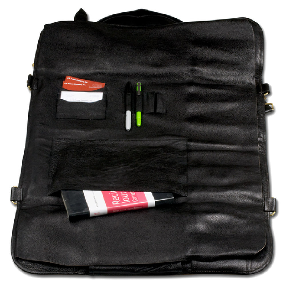 The JB Prince Z255 Boldric Knife Bag is a versatile and meticulously designed accessory for culinary professionals, featuring 18 pockets to accommodate various tools and essentials. This knife bag is equipped with 17 dedicated slots for knives and tools, catering to chefs and culinary enthusiasts who require precise organization and accessibility. In addition to knife slots, the bag includes one utility pocket, providing additional storage for miscellaneous items. For professionals who value efficiency and organization, the bag offers three slots for business cards, ensuring that networking materials are readily available. Furthermore, the bag is designed with four pen loops, allowing for easy access to writing instruments. Crafted from high-quality black leather, the JB Prince Z255 Boldric Knife Bag delivers both durability and style, making it an ideal choice for those in the culinary industry. This bag is particularly suited for chefs, culinary students, and caterers who prioritize functionality and elegance in their tools. By combining robust construction with a practical layout, this knife bag serves as a reliable companion in various professional kitchen settings, enhancing both the storage and transportation of essential culinary instruments.