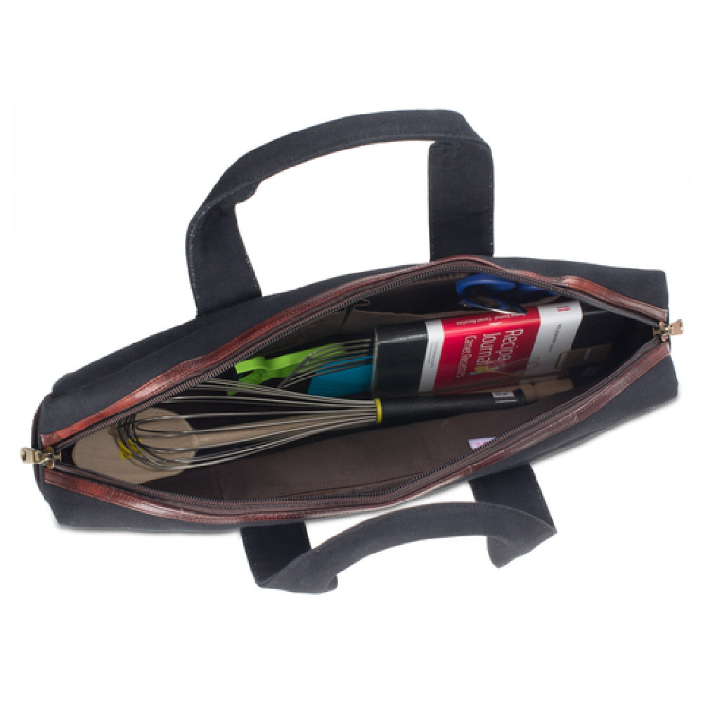 The JB Prince Z264 Boldric Chef Carryall Bag is a meticulously designed accessory catering to culinary professionals who value both functionality and style. This versatile carryall boasts a durable canvas body, complemented by brown leather trim, imparting a sophisticated aesthetic. Its robust construction is further enhanced by exterior brass grommets and brass feet, providing additional resilience and stability. The black-colored exterior is both sleek and practical, making it suitable for various settings. Inside, the bag features a nylon interior, ensuring easy cleaning and maintenance, while offering a secure, protective environment for your culinary tools. For convenient access and organization, the carryall is equipped with one zip pocket and two side pockets, ideal for storing and segregating various kitchen essentials. Whether you are a professional chef, culinary student, or cooking enthusiast, the JB Prince Z264 Boldric Chef Carryall Bag seamlessly combines durability, style, and functionality, making it a valuable addition to your culinary toolkit.