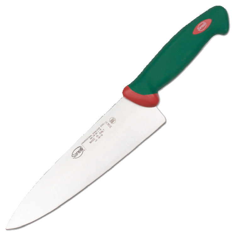 The JB Prince Z288 Sanelli Chef's Knife - 8-1/2" Stamped Ergonomic Rubber Handle is a precision-crafted culinary tool, engineered for professional chefs and cooking enthusiasts alike. This knife features an 8-1/2 inch stamped stainless steel blade, offering a balance of strength and flexibility that is essential for diverse kitchen tasks. The ergonomic rubber handle, showcased in distinctive green and red colors, ensures a comfortable and secure grip, enhancing user safety and precision during cutting activities. This knife is NSF certified, highlighting its adherence to rigorous food safety and public health standards, making it an excellent choice for commercial and residential kitchens that prioritize hygiene and quality. Made in Italy, this chef's knife embodies the craftsmanship and attention to detail synonymous with Italian cutlery, ensuring durability and long-lasting performance. The JB Prince Z288 Sanelli Chef's Knife is tailored to meet the needs of different segments within the culinary industry, from restaurant chefs seeking reliable performance to home cooks desiring professional quality in their kitchen arsenal. Its thoughtful design and robust construction make it an indispensable tool for any culinary setting, combining traditional quality with modern ergonomics.
