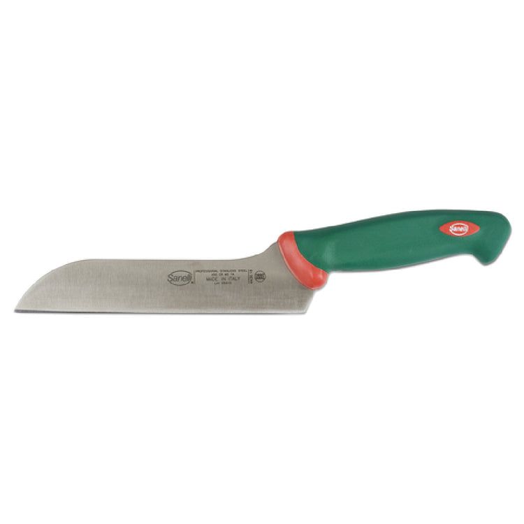 The JB Prince Z294 Sanelli Restaurant Cheese Knife is a well-crafted tool designed for the skilled needs of culinary professionals. Featuring a 7-inch stamped stainless steel blade, this knife is perfect for precise cutting and slicing tasks in any restaurant setting. Its offset design ensures that the user’s hand is kept safely away from the cutting surface, which minimizes the risk of injury and enhances control during use. Additionally, the ergonomic rubber handle provides a comfortable grip, reducing strain during prolonged periods of cutting. The knife is adorned with a distinctive green and red color scheme, adding an element of style to its functional design. NSF certification signifies that this product meets high standards for public health protection, making it a reliable choice for industry professionals. Made in Italy, the JB Prince Z294 embodies quality craftsmanship and meticulous attention to detail, ensuring durability and longevity. This cheese knife is particularly valuable for various market segments, including high-end restaurants and catering services, where precision and reliability are paramount. With its blend of ergonomic design and high-quality materials, the JB Prince Z294 Sanelli Restaurant Cheese Knife stands out as a superior tool for chefs who demand excellence in their culinary equipment.
