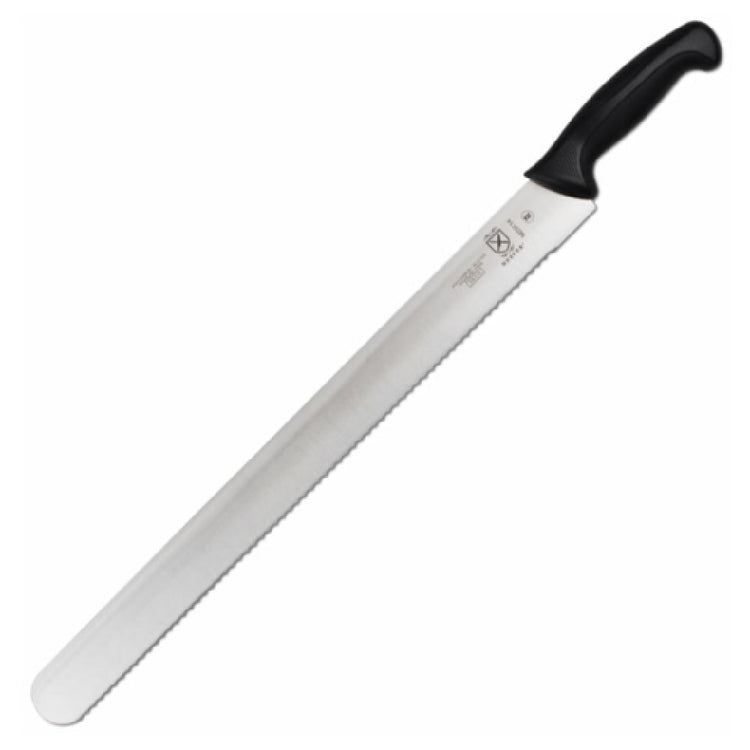 The JB Prince Z297 Cake Knife / Slicer is an expertly crafted tool designed for precision and efficiency in the culinary world. Measuring an impressive 18 inches in length, this extra-long knife is ideal for slicing through large cakes and pastries with ease. The blade is constructed from high carbon stainless steel, a material renowned for its durability and ability to maintain a sharp edge, providing consistent performance over time. The handle is made from plastic, ensuring a lightweight yet sturdy grip that aids in maneuverability and control during use. This cake knife is NSF certified, signifying its compliance with strict public health and safety standards, making it a trusted choice for professional chefs and bakers. The JB Prince Z297 is particularly well-suited for use in bakery environments, catering services, and high-volume food preparation settings where precision and reliability are paramount. Its robust design and high-quality materials make it a valuable addition to any commercial kitchen, reflecting JB Prince's commitment to providing tools that meet the demanding needs of the food service industry.