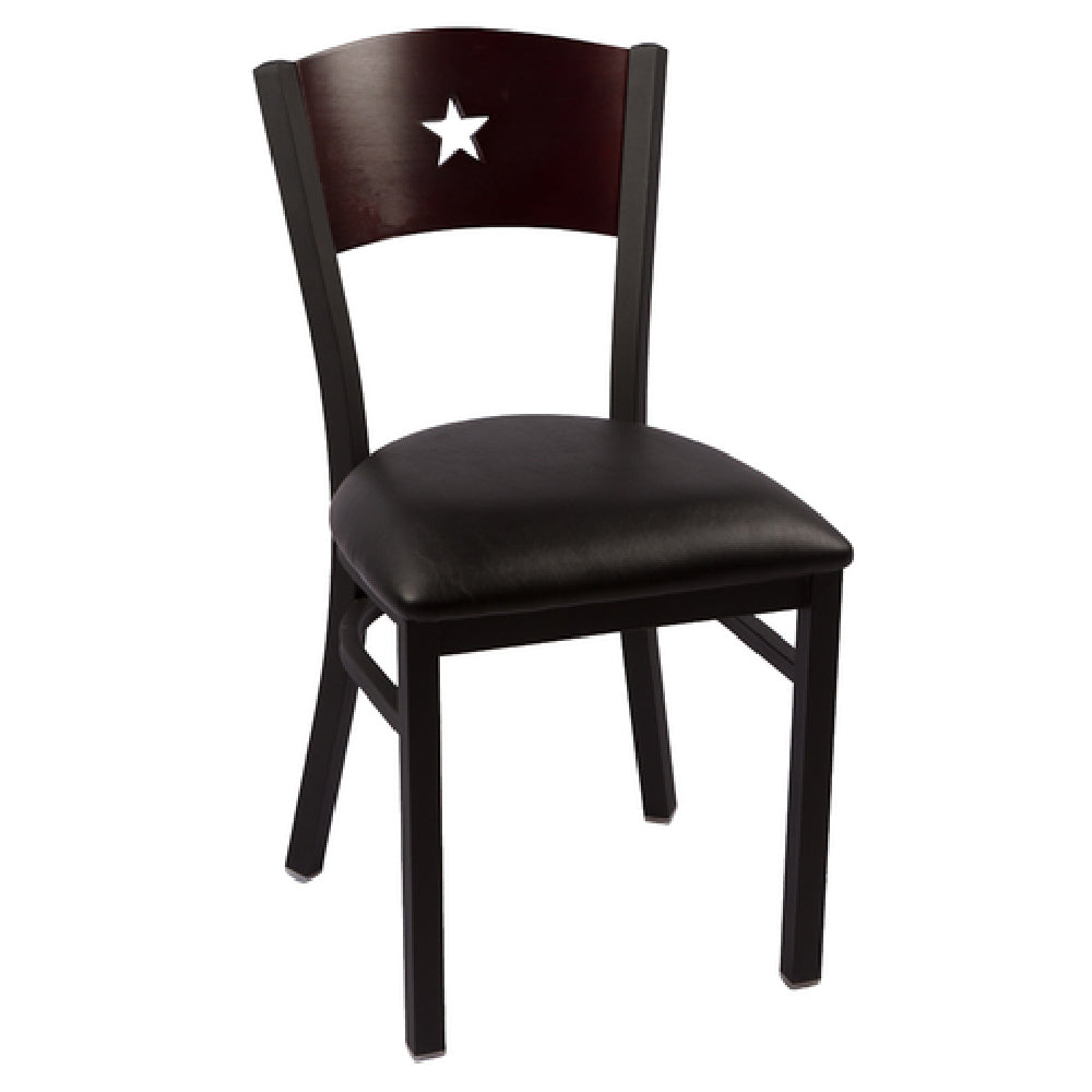 The JMC Furniture LIBERTY SERIES CC CHAIR VINYL - Liberty Series Side Chair for Indoor Use - stands out as a versatile seating solution tailored for diverse market segments, from hospitality to corporate environments. This chair features a wood back with an aesthetically pleasing star cutout, adding a touch of elegance to any interior setting. The vinyl seat provides comfort and durability, making it suitable for high-traffic areas. Structurally, the chair is supported by a metal frame with a clear coat finish, ensuring both longevity and a sleek, contemporary appearance. The clear coat not only enhances the chair's visual appeal but also offers protection against wear and tear. Assembling this chair is required, allowing businesses to efficiently manage storage and transportation. By combining a sturdy metal frame with a stylish wood and vinyl finish, the JMC Furniture LIBERTY SERIES CC CHAIR VINYL is an ideal choice for those seeking a balance of form and function. Its design elements cater to the aesthetic and practical needs of various industries, providing a reliable seating option that fits seamlessly into any indoor environment.