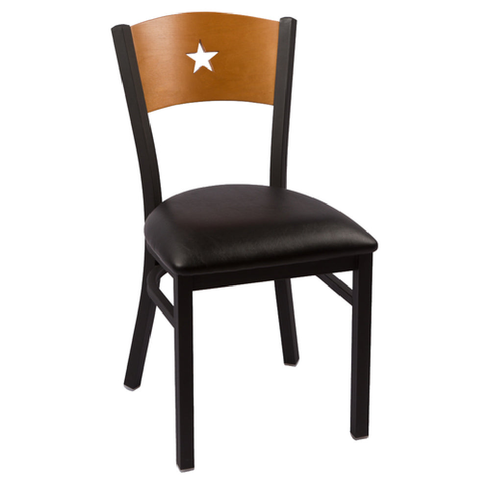 The JMC Furniture LIBERTY SERIES CLEAR COAT CHAIR VINYL - Liberty Series Side Chair Indoor Use is a meticulously designed piece of furniture crafted for indoor environments. This chair features a distinct wood back with a star cutout, adding a touch of elegance and uniqueness to any space. The chair's seat is upholstered in durable vinyl, ensuring comfort and longevity for regular use in high-traffic areas. Supporting the robust design is a metal frame finished with an industrial clear coat, which not only enhances the chair's contemporary aesthetic but also provides excellent durability and resistance to wear. This chair requires assembly, making it practical for transportation and storage prior to setup. The combination of materials and design makes this chair versatile for various market segments, including hospitality, commercial, and residential spaces, where both style and functionality are paramount. Its blend of wood, metal, and vinyl materials ensures that it meets the demands of diverse interior design themes while offering a reliable seating solution. The JMC Furniture LIBERTY SERIES CLEAR COAT CHAIR VINYL embodies a balance of modern style and practical construction, making it a valuable addition to any indoor setting.