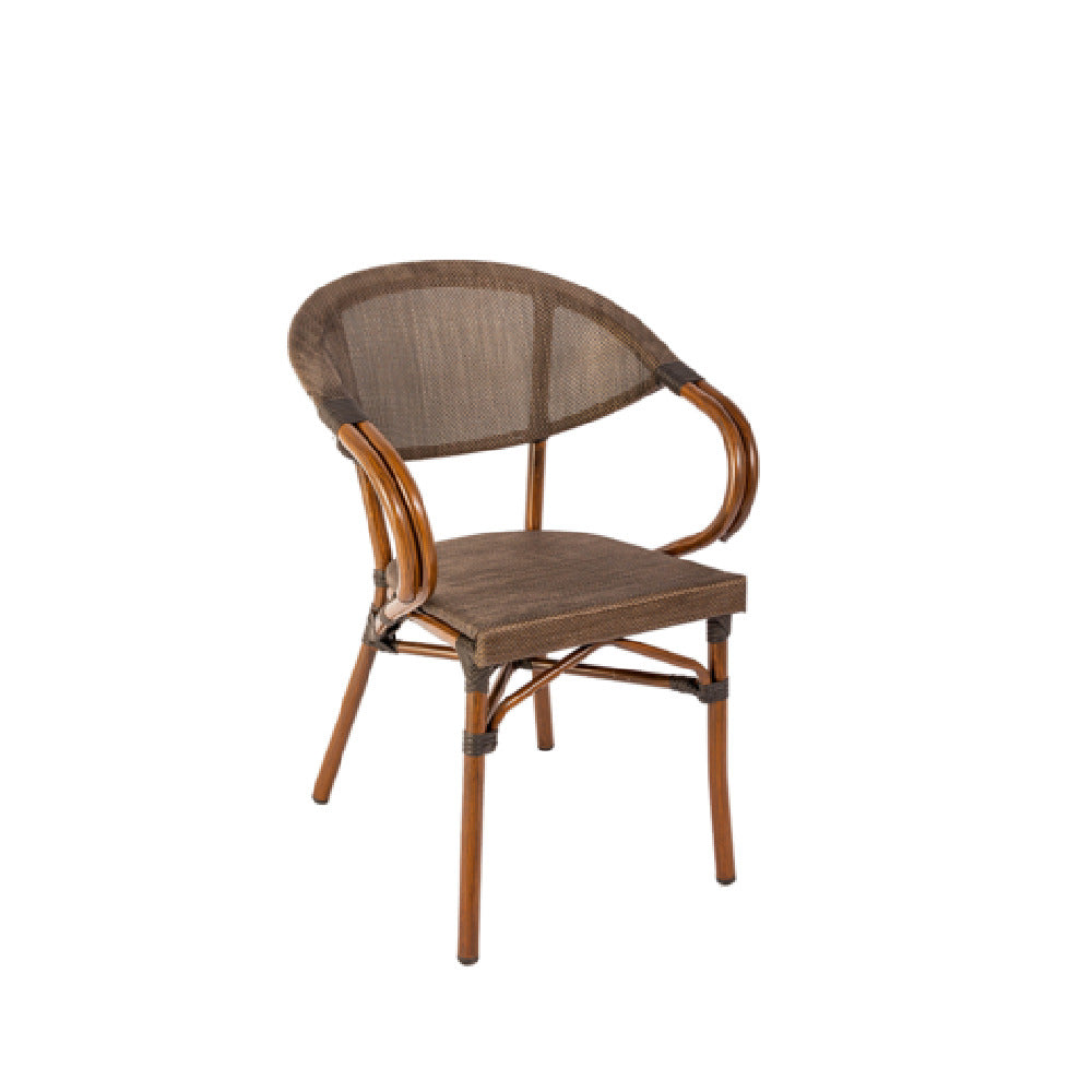 The JMC Furniture MAGELLAN ARM CHAIR is an exceptional piece designed for outdoor use, featuring a synthetic espresso weave seat and back that harmoniously blend style with resilience. This chair is engineered with an aluminum frame, providing a robust yet lightweight structure, ensuring both durability and ease of movement. The synthetic espresso weave not only offers a sophisticated aesthetic but also withstands varying weather conditions, making it an ideal choice for different environments, from residential patios to commercial outdoor dining areas. The chair's design caters to diverse market segments, including hospitality venues, such as hotels and resorts, where outdoor seating must balance elegance with functionality. The MAGELLAN ARM CHAIR's distinctive weave pattern adds a touch of luxury to any outdoor setting, appealing to design-conscious individuals seeking both comfort and style in their outdoor furniture choices. Its aluminum frame ensures longevity, offering a maintenance-free solution for busy spaces. This chair stands out in the outdoor furniture industry due to its combination of aesthetic appeal, structural integrity, and adaptability, making it a valuable asset for any establishment aiming to enhance their outdoor seating experience.