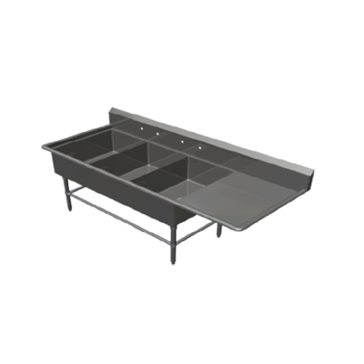 The John Boos 3PB2028-1D30R Pro-Bowl Sink is a versatile and robust three-compartment sink designed for professional kitchens requiring durability and efficiency. This sink boasts an overall size of 94-3/16"W x 33-1/2"D x 44-1/16"H, making it a sizable option for handling large kitchen tasks. It features three 20"W x 28" front-to-back x 12" deep compartments, allowing for organized multitasking in washing, rinsing, and sanitizing. A 30" right drainboard provides additional workspace for drying and organizing. The sink is equipped with a 10"H boxed backsplash, designed with a 45° top and a 2" return to protect kitchen walls from splashes. Built with 16/300 stainless steel construction, it promises durability and resistance to corrosion. The inclusion of a set of splash mount faucet holes with 8" centers and a 3-1/2" die-stamped drain opening enhances its functionality. Stainless steel legs with adjustable front and side bracing, along with adjustable bullet feet, ensure stability on any kitchen floor. Certified by NSF and CSA-Sanitation, this knockdown (KD) sink meets high hygiene and safety standards, making it an excellent choice for restaurants, hotels, and other commercial food service environments.