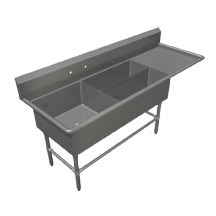 The John Boos 3PBPS32244-1D24R Pro-Bowl Platter Sink is an industrial-grade three-compartment sink, featuring an overall size of 84-3/16 inches in width, 29-1/2 inches in depth, and 43 inches in height. It includes one 24-inch wide by 24-inch front-to-back by 14-inch deep compartment and two 32-inch wide by 12-inch front-to-back by 14-inch deep compartments, catering to diverse cleaning and preparation needs. A 24-inch right drainboard provides additional utility for drying and staging. The sink is designed with a 10-inch high boxed backsplash, angled at 45 degrees with a 2-inch return, preventing water spillage and protecting walls. Its splash mount faucet holes with 8-inch centers allow the installation of a variety of faucet types. Built with 16/300 stainless steel construction, the sink promises durability and resistance to corrosion, supported by stainless steel legs with adjustable front and side bracing, ensuring stability. The adjustable bullet feet allow for leveling on uneven surfaces. The three 3-1/2-inch die-stamped drain openings guarantee efficient drainage. Meeting NSF and CSA-Sanitation standards, this sink is suitable for commercial kitchens, ensuring high standards of hygiene and functionality, making it an invaluable asset to food service environments requiring robust, reliable equipment.