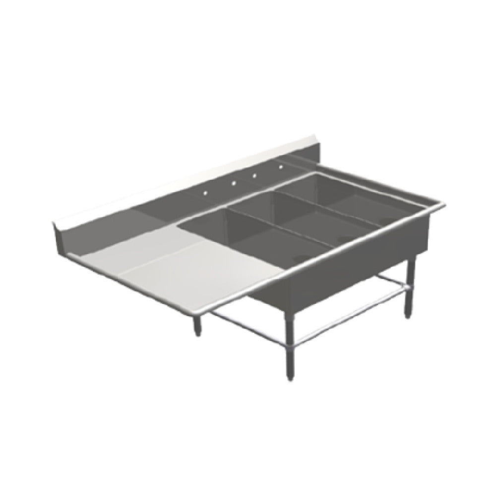 The John Boos 43PB14314-1D18L Pro-Bowl Platter Sink is a high-performance unit designed for professional kitchens, featuring a 3-compartment layout with an overall size of 64-3/16 inches wide by 36-1/2 inches deep by 43 inches high. Each compartment measures 14 inches wide, 31 inches front-to-back, and 14 inches deep, catering to the needs of diverse food service operations. This sink includes an 18-inch left drainboard for added convenience in dishwashing routines. A 10-inch high boxed backsplash with a 45-degree top and 2-inch return ensures efficient water containment. Further enhancing its utility, the sink is equipped with one set of splash mount faucet holes with 8-inch centers, and 3-1/2-inch die-stamped drain openings. Constructed from 14/300 stainless steel, it boasts stainless steel legs with adjustable front and side bracing, along with adjustable bullet feet for stability. The sink is NSF and CSA-Sanitation certified, ensuring compliance with hygiene standards. Its KD (knockdown) design facilitates streamlined assembly. The robust construction and thoughtful design make this sink an essential asset for a range of food service environments, delivering durability and functionality to support high-demand kitchen operations.