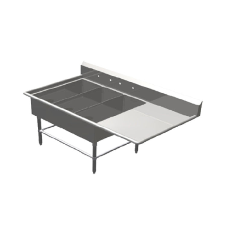The John Boos 43PB14314-1D30R Pro-Bowl Platter Sink is a meticulously engineered solution for commercial kitchens requiring a high-capacity, multi-functional workspace. This unit features a 3-compartment design, each compartment measuring 14"W x 31" front-to-back x 14" deep, providing ample space for a variety of kitchen tasks. The overall dimensions of 76-3/16"W x 36-1/2"D x 43"H make it an expansive addition to any food preparation area. A 30" right drainboard enhances functionality by allowing for efficient water drainage. The sink is equipped with a 10"H boxed backsplash, featuring a 45-degree top and 2" return, effectively protecting walls from splashes. It includes a set of splash mount faucet holes with 8" centers, accommodating a range of faucet styles. Constructed from 14/300 stainless steel, this sink promises durability and resistance to corrosion, supported by stainless steel legs and adjustable front and side bracing for stability. The adjustable bullet feet ensure a level installation on uneven surfaces. With 3-1/2" die-stamped drain openings, this sink supports efficient waste disposal. Certified by NSF and CSA-Sanitation, it meets stringent public health and safety standards, making it an exceptional choice for any professional culinary environment.