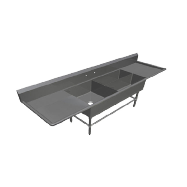 The John Boos 43PBPS3224-2D30 Pro-Bowl Platter Sink is a high-quality stainless steel sink designed for professional environments requiring robust and versatile washing solutions. This 3-compartment sink spans an expansive 119-3/16" in width, 29-1/2" in depth, and stands 43" tall, providing ample space for a variety of kitchen operations. The sink features a 24"W x 24" front-to-back x 12" deep compartment, complemented by two additional 32"W x 12" front-to-back x 12" deep compartments, optimizing efficiency for multiple simultaneous tasks. Flanking the sink are two 30" drainboards, one on the left and one on the right, offering additional workspace for draining and drying. The 10" high boxed backsplash, designed with a 45° top and a 2" return, ensures cleanliness and prevents water spillage onto walls. For seamless integration of water supply, the unit includes a set of splash mount faucet holes with 8" centers and 3-1/2" die-stamped openings. Constructed from durable 14/300 stainless steel, it stands securely on stainless steel legs with adjustable front and side bracing and bullet feet, ensuring stability on any surface. Certified by NSF and CSA-Sanitation, the John Boos Pro-Bowl Platter Sink is a reliable and essential addition to high-demand commercial kitchens.