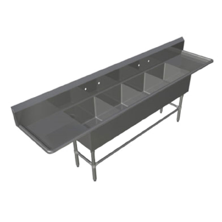 The John Boos 44PB184-2D18 Pro-Bowl Sink stands as a formidable 4-compartment solution for professional kitchens and industrial spaces requiring efficient multitasking capabilities. Measuring 111-1/4 inches in width, 23-1/2 inches in depth, and 44-1/16 inches in height overall, this sink is engineered to meet high-volume demands. Each of the four compartments measures 18 inches wide by 18 inches front-to-back with a depth of 14 inches, providing ample space for various tasks. The sink also features two 18-inch left and right drainboards, adding to its functionality. An essential component for cleanliness and maintenance, the 10-inch high boxed backsplash is designed with a 45-degree top and 2-inch return. The sink accommodates two sets of splash mount faucet holes with 8-inch centers, ensuring flexibility in installation. Crafted from durable 14/300 stainless steel, the sink is supported by robust stainless steel legs with adjustable front and side bracing, as well as adjustable bullet feet for stability. The 3-1/2-inch die-stamped drain openings facilitate efficient water drainage. Certified by NSF and CSA-Sanitation, this knockdown (KD) unit underscores compliance with sanitation standards, making it an indispensable asset for establishments prioritizing hygiene and efficiency.