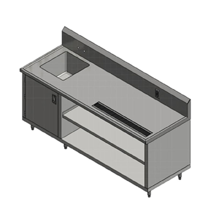 The John Boos 4CB4R10-30120-L Beverage Table Cabinet Base With Open Front is a versatile addition to any commercial kitchen or beverage service area, measuring 120"W x 30"D x 45-3/4"H. Its 14/300 stainless steel top is designed with a 10" backsplash and a marine edge top, providing durability and preventing spills. The table features a Stallion Safety Edge front and square turndown ends, ensuring safety and structural integrity. For efficient beverage preparation, a 18"W x 18" front-to-back x 12" deep sink is positioned on the left, equipped with a 3-1/2" drain opening and a hinged door in front. A set of splash mount faucet holes with 4" centers accommodates various faucet options. The 36" urn trough coupled with a louvered grate includes a 2" drain, optimizing liquid disposal. An intermediate shelf offers additional storage, while the 18/430 stainless steel wrap, along with legs and adjustable feet, ensures stability. For added convenience, the unit includes a 1-ph duplex outlet in the backsplash. NSF certification guarantees compliance with public health standards, making this beverage table an excellent choice for environments demanding high efficiency and safety.