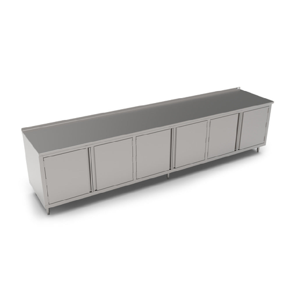 The John Boos 4CH6R1.5-24144 Work Table Cabinet Base With (3) Sets Of Hinged Doors is an industrial-grade workstation designed for optimal efficiency and durability. Measuring 144 inches in width and 24 inches in depth, this work table is crafted with a 16/300 stainless steel top, known for its resistance to corrosion and hygienic properties, making it ideal for food service environments. The table features a 1-1/2 inch rear up-turn, preventing spills and debris from falling behind the unit, ensuring cleanliness and ease of maintenance. Its Stallion Safety Edge front offers enhanced safety by eliminating sharp edges, reducing the risk of injury. The cabinet base includes (3) sets of hinged doors, providing secure and convenient storage options for kitchen essentials. Wrapped in 18/430 stainless steel, the unit's exterior combines robustness with an appealing finish, while the stainless steel legs with adjustable feet ensure stability on uneven surfaces. Certified by NSF, this work table adheres to public health and safety standards. The John Boos 4CH6R1.5-24144 is a versatile solution for professional kitchens, catering to diverse operational needs with a focus on quality and practicality.