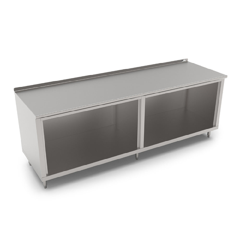 John Boos 4CO4R1.5-30120 Work Table Cabinet Base With Open Front 120"W x 30"D is engineered to meet the rigorous demands of professional kitchens and versatile work environments. This work table features a spacious 120-inch width and 30-inch depth, providing ample surface area for efficient preparation and organization. The top is constructed from high-quality 14-gauge 300 series stainless steel, ensuring durability and resistance to corrosion. It is equipped with a 1-1/2-inch rear up-turn, designed to prevent spills and splashes from reaching walls or other surrounding surfaces, enhancing cleanliness and hygiene. The Stallion Safety Edge front reduces the risk of accidents by providing a smooth, rounded edge. Complementing the robust top is an 18-gauge, 430 series stainless steel wrap that enhances the structural integrity of the unit. The work table is supported by stainless steel legs that feature adjustable feet, allowing for stability on uneven surfaces. Designed with an open front cabinet base, it offers easy access to stored items, making it ideal for fast-paced environments where efficiency is key. This product is NSF certified, reflecting its compliance with strict public health and safety standards, making it a reliable choice for commercial applications.