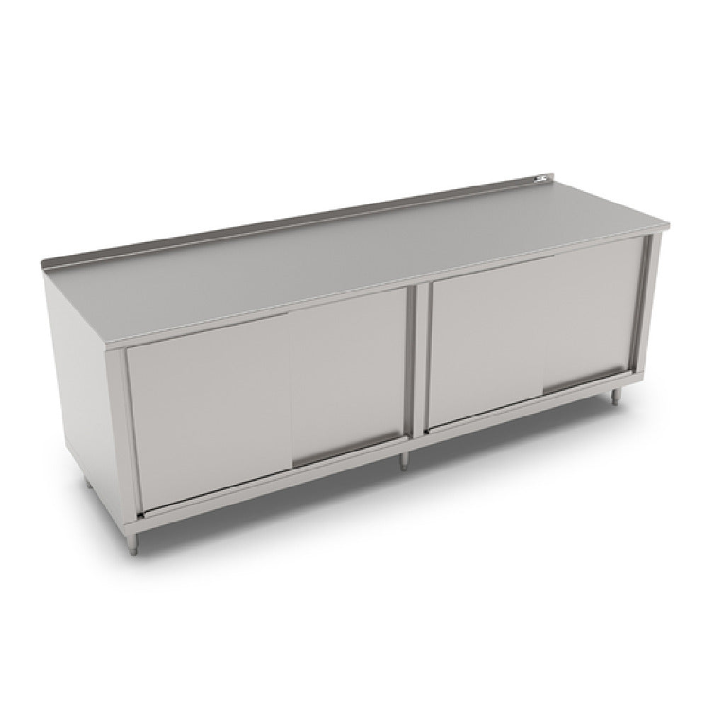The John Boos 4CS4R1.5-30120 Work Table Cabinet Base With Sliding Doors - 120"W x 30"D is a high-quality work table designed for optimal efficiency in professional kitchens and food service environments. Featuring a 14/300 stainless steel top with a 1-1/2" rear up-turn, this table is engineered for durability and easy cleaning. The Stallion Safety Edge front enhances safety by minimizing accidental impacts, making it ideal for high-traffic areas. Its cabinet base is constructed with 18/430 stainless steel, providing a sturdy frame and corrosion resistance. The integrated sliding doors offer convenient access to stored items, allowing for efficient use of space in busy kitchen settings. The table’s stainless steel legs are equipped with adjustable feet, ensuring stability on uneven surfaces. Moreover, the product is NSF certified, meeting strict standards for public health protection. With its robust dimensions of 120 inches in width and 30 inches in depth, this work table is suitable for various applications, from food preparation to equipment storage, catering to the needs of restaurants, hotels, and catering services. Its exceptional build quality and practical design make it a valuable investment for industries requiring reliable and spacious work surfaces.