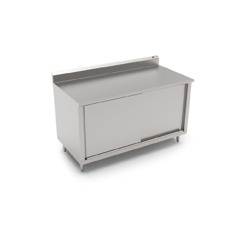 The John Boos 4CS4R5-2448 Work Table Cabinet Base With Sliding Doors 48"W X 24"D is a meticulously designed piece of equipment that caters to a variety of professional kitchen environments, from bustling restaurants to industrial food preparation spaces. This work table features a 14/300 stainless steel top, renowned for its durability and resistance to corrosion, ensuring longevity in demanding environments. The 5" backsplash serves as a protective barrier against spills and splashes, maintaining cleanliness and safety. With a cabinet base crafted from 18/430 stainless steel, the unit is both sturdy and easy to maintain, offering reliable storage capabilities. The sliding doors enhance accessibility while preserving kitchen space. Stainless steel legs with adjustable feet provide stability on uneven surfaces, enhancing the table's versatility in different settings. Certified by NSF, this work table adheres to stringent public health and safety standards, underscoring its suitability for professional use. The John Boos 4CS4R5-2448 work table combines functionality and robust design, making it an essential asset for food service operations seeking reliability and efficiency in their kitchen equipment.