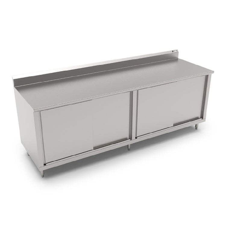 The John Boos 4CS4R5-2496 Work Table Cabinet Base With Sliding Doors stands out with its substantial dimensions of 96 inches in width and 24 inches in depth, offering ample workspace for various industrial applications. Its top is crafted from 14-gauge, 300-series stainless steel, providing exceptional durability and resistance to corrosion. Accompanied by a 5-inch backsplash, the table ensures cleanliness and efficiency by preventing spillage onto surrounding surfaces. The Stallion Safety Edge front enhances safety by minimizing sharp edges. The body of the cabinet base is constructed from 18-gauge, 430-series stainless steel, striking a balance between cost-effectiveness and durability. The work table is supported by stainless steel legs that include adjustable feet, ensuring stability on uneven surfaces and adaptability to different working environments. With sliding doors integrated into the cabinet base, it allows for easy and convenient access to stored items without requiring additional clearance space. Being NSF certified, this work table meets stringent public health standards, making it suitable for food service environments, such as commercial kitchens and catering businesses, where hygiene and durability are paramount. This product is engineered to withstand the rigors of daily use while maintaining a professional and clean appearance, making it a valuable addition to any professional setting.