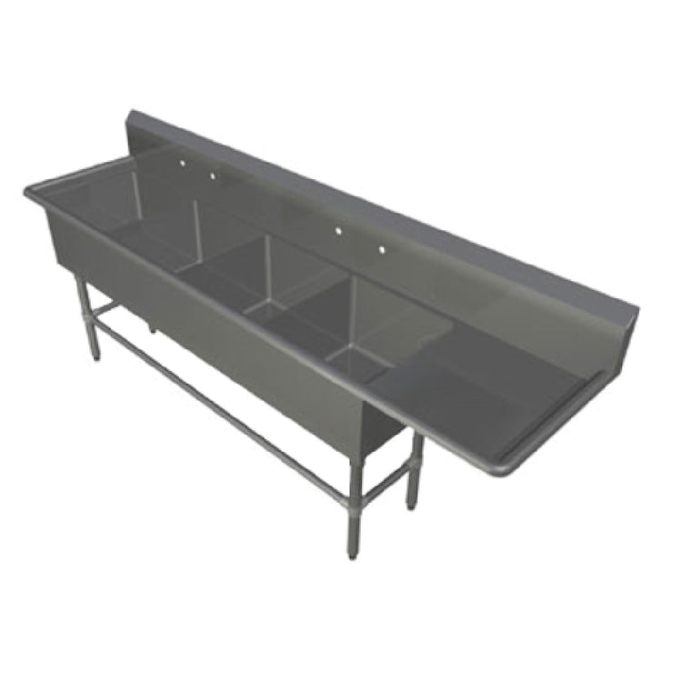 John Boos 4PB3024-1D30R Pro-Bowl Sink is a highly functional and durable solution for commercial kitchens, designed with precision and efficiency in mind. With its overall dimensions of 154-3/16"W x 29-1/2"D x 44-1/16"H, this sink offers ample workspace, featuring four compartments that each measure 30"W x 24" front-to-back x 12" deep. This thoughtful design supports varied washing and rinsing tasks simultaneously, optimizing workflow in busy environments. The inclusion of a 30" right drainboard enhances functionality, providing a convenient space for drying. The 10"H boxed backsplash with a 45-degree top and 2" return helps protect walls from splashes, contributing to a cleaner workspace. Equipped with two sets of splash mount faucet holes with 8" centers and 3-1/2" die-stamped drain openings, the sink is compatible with industry-standard plumbing fixtures. Constructed from 16/300 stainless steel, it assures durability and resistance to corrosion. The stainless steel legs, along with adjustable front and side bracing and bullet feet, ensure stability and adaptability to uneven floors. NSF and CSA-Sanitation certifications affirm its compliance with health standards, making it an ideal choice for restaurants, hotels, and catering businesses seeking a reliable, high-capacity sink that meets rigorous industry demands.