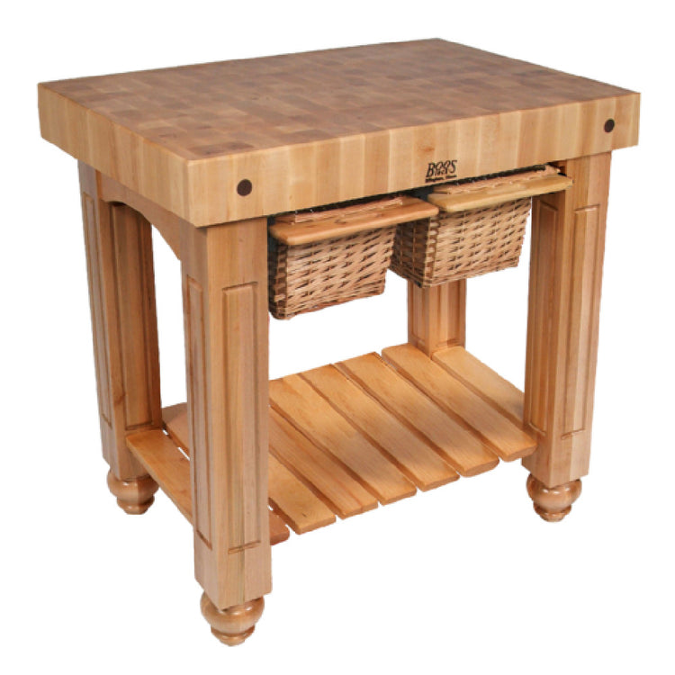 The John Boos CU-GB3624 American Heritage Gathering Block II is a meticulously crafted kitchen centerpiece, ideal for both professional and home environments. Measuring 36 inches in width, 24 inches in depth, and 36 inches in height, this gathering block stands as a testament to functional design and robust construction. The top is 4 inches thick and made from end grain Northern Hard Rock Maple, renowned for its durability and aesthetic appeal, finished with oil to enhance the natural wood grain. The block features two wicker baskets that can be accessed from either side, adding utility and convenience for storage. The painted wood base complements its rustic charm, and a slatted undershelf offers additional space for organization. The distressed finish gives it an antique allure, making it a unique addition to any kitchen or culinary space. This gathering block is versatile for various segments, from upscale home kitchens to bustling commercial settings, providing a blend of style and practicality.