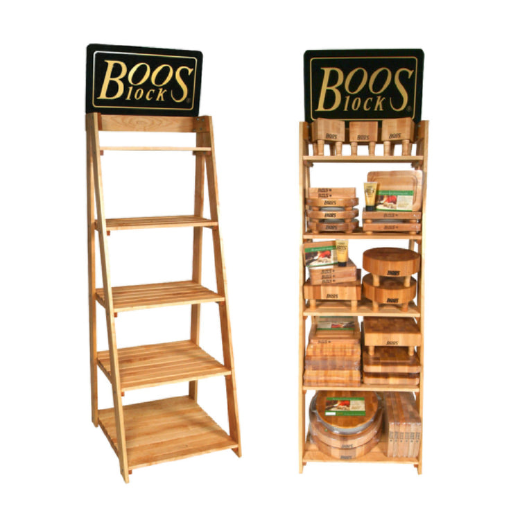 The John Boos DRACKB4 Cutting Board Display Rack is an expertly crafted piece designed for optimal display and functionality in both commercial and home kitchens. Measuring 27 inches wide by 27 inches deep and 48 inches high, this display rack offers a spacious and organized solution with its three sturdy shelves. Constructed from Northern Hard Rock Maple, a material renowned for its durability and strength, it provides a robust platform for cutting board display and storage. The Varnique finish adds a layer of protection, enhancing the rack's resistance to moisture and daily wear, while also giving it a smooth, polished look. This rack is delivered in a "KD" (knock-down) format, ensuring easy assembly upon arrival, making it a practical choice for businesses that require efficient setup and relocation options. Tailored for culinary establishments, retail environments, and even serious home chefs, this display rack combines functionality with aesthetic appeal, making it a versatile addition to any setting requiring organized and attractive presentation of cutting boards.