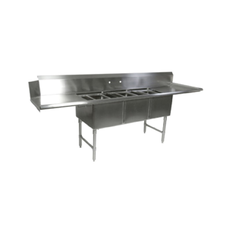 The John Boos DT3B18244-2D24R Dishtable/Pot Sinks Clean Straight Design is a meticulously crafted piece of kitchen infrastructure that meets the rigorous demands of professional food service environments. This unit measures 103-5/8"W x 30-3/8"D x 44-1/16"H, featuring three 18"W x 24" front-to-back x 14" deep compartments, providing ample space for washing and rinsing tasks. Complemented by two 24" drainboards, it efficiently supports dishwashing workflows. Its dish machine attachment on the left side seamlessly integrates with existing kitchen setups, enhancing operational efficiency. The 10"H boxed backsplash prevents spillage, maintaining cleanliness in busy kitchens. Engineered with a set of splash mount faucet holes with 8" centers, it accommodates standard faucet installations. Additionally, the unit includes three rack slides with a storage bracket, optimizing organization and accessibility. Constructed from 16/300 stainless steel, it promises durability and resistance to corrosion, while stainless steel legs, bracing, and adjustable bullet feet ensure stability on uneven surfaces. Certified by NSF and CSA-Sanitation, this model adheres to industry standards for safety and sanitation. With limited options available, it caters to diverse market segments, from bustling restaurants to industrial kitchens, prioritizing both functionality and hygiene.