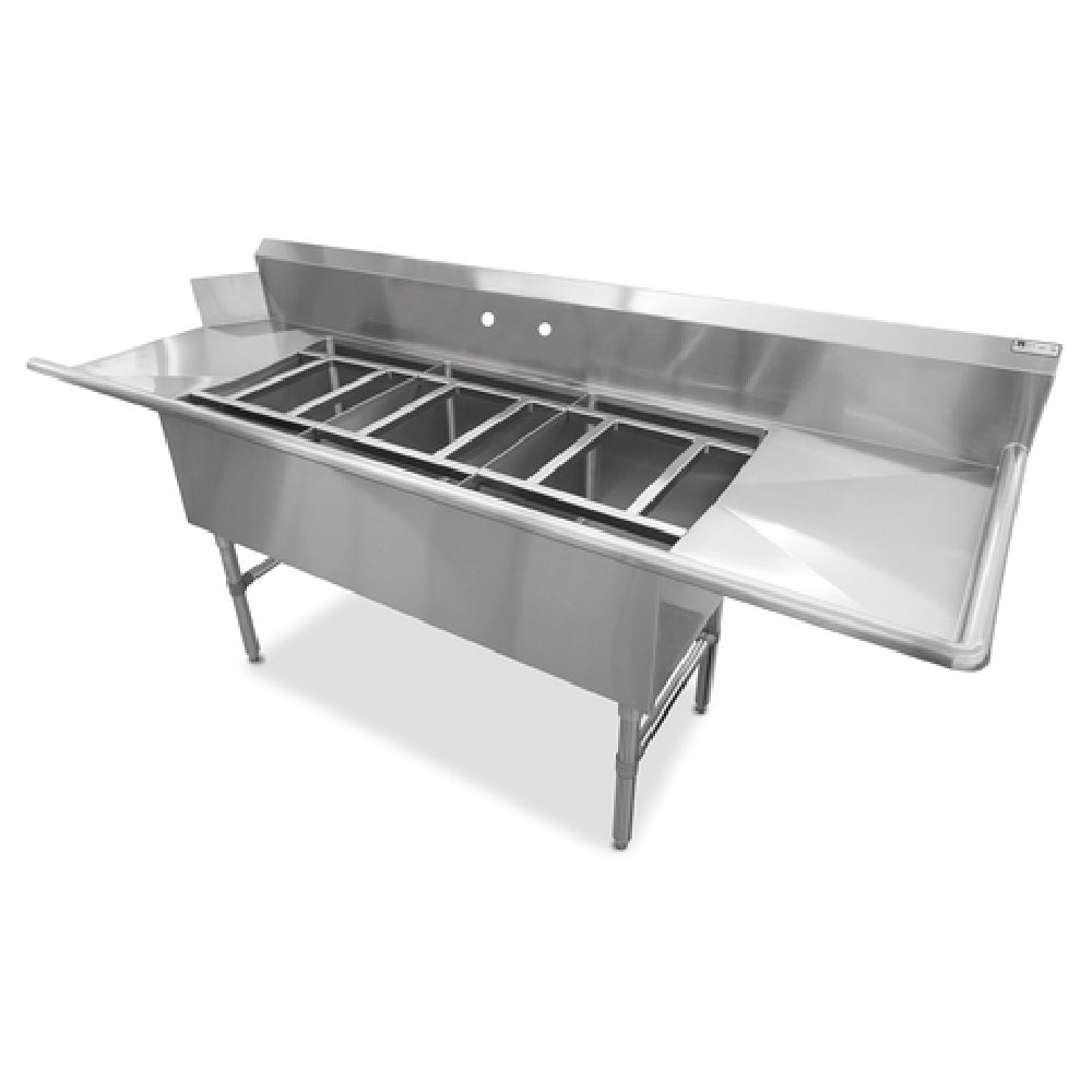 The John Boos DT3PB18244-2D24R Dishtable/Pot Sinks Clean Straight Design is engineered to meet demanding commercial kitchen needs with precision and efficiency. Measuring 103-5/8 inches wide by 30-3/8 inches deep and 44-1/16 inches high, this versatile unit features three spacious compartments, each 18 inches wide, 24 inches front-to-back, and 14 inches deep. It is equipped with two 24-inch drainboards and a dish machine attachment conveniently located on the left side, optimizing workflow. The 10-inch high boxed backsplash ensures cleanliness and prevents water spillage, enhancing operational hygiene. Featuring a set of splash mount faucet holes with 8-inch centers, the dishtable is tailored for quick and easy faucet installation. Three rack slides with a storage bracket provide additional functionality. Constructed from durable 16-gauge, type 300 stainless steel, the unit is built to withstand rigorous use. The sturdy stainless steel legs, bracing, and adjustable bullet feet ensure stability and adaptability on uneven surfaces. Certified by NSF and CSA-Sanitation, this dishtable/pot sink combination is designed to support the demanding environments of foodservice facilities, making it an essential asset for maintaining high standards of cleanliness and efficiency in professional kitchens.