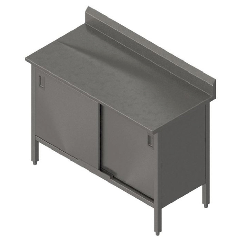 The John Boos EBHS4R5-3048 work table cabinet base with hinged doors is a meticulously crafted piece of equipment designed to meet the diverse needs of various industry sectors. This work table features a 48-inch wide by 30-inch deep surface, providing ample workspace. It boasts a 14/300 stainless steel top, ensuring durability and resistance to corrosion, essential for rigorous use in commercial kitchens and food preparation environments. The addition of a 5-inch backsplash helps maintain a clean workspace by preventing spills and debris. The Stallion Safety Edge front and 90-degree turndown on the sides enhance safety and functionality, reducing the risk of injury and ensuring a smooth work surface. The stainless steel base and undershelf provide additional storage, maximizing space utility. Equipped with 1-inch adjustable bullet feet, this table offers stability on uneven surfaces. The all-welded set-up guarantees robustness and longevity, while NSF certification highlights its compliance with health and safety standards. This versatile work table is ideal for restaurants, catering services, and industrial kitchens, providing a reliable and efficient workspace tailored to demanding operational needs.