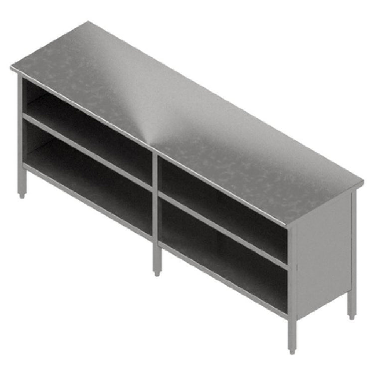 The John Boos EBOS6-30120 Work Table Cabinet Base With Open Front is a highly functional piece of equipment designed to meet the diverse needs of various segments within the food service and industrial sectors. Measuring 120 inches in width and 30 inches in depth, this work table provides ample workspace for efficient operations. Its 16-gauge, 300-series stainless steel flat top ensures durability and easy maintenance, making it suitable for high-demand environments. The Stallion Safety Edge on the front and back provides safety and comfort during use, while the 90-degree turndown on the sides adds to its sleek design. The stainless steel base and undershelf offer robust support and additional storage options. The unit stands firmly on 1-inch adjustable bullet feet, allowing for stability on uneven surfaces. All components are welded and set-up, ensuring the table's structural integrity and longevity. The open-front design enhances accessibility, catering to dynamic workspaces that require quick and easy access to stored items. This work table is NSF certified, signifying its adherence to strict public health standards, making it an ideal choice for professional kitchens and industrial settings that prioritize quality and hygiene.