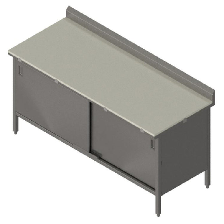 The John Boos EBSP3R5-3084 Work Table Cabinet Base With Sliding Doors is a versatile and robust addition to any commercial kitchen or workspace, measuring 84"W x 30"D. This unit is designed with a 16/300 stainless steel top, ensuring durability and resistance to corrosion, and features a 5" backsplash for added cleanliness and protection against spills. It includes a 3/4" reversible poly surface, providing a reliable work area that is both sturdy and adaptable. The Stallion Safety Edge on the front enhances safety and comfort, while the 90-degree turndown on the sides offers a sleek, professional appearance. The stainless steel base, complete with an undershelf, provides ample storage space and stability. This work table is equipped with 1" adjustable bullet feet, allowing for customization to suit various floor surfaces and ensuring level placement. The all-welded set-up guarantees a solid construction, promoting longevity and reliability in demanding environments. Certified by the NSF, this work table meets high standards of public health and safety, making it an excellent choice for food service operations. With its combination of practical design and high-quality materials, the John Boos EBSP3R5-3084 is an invaluable asset for a wide range of industries, from restaurants to laboratories.