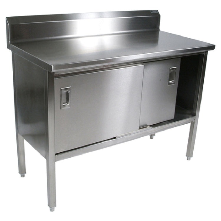 The John Boos EBSS4R5-24132 Work Table Cabinet Base With Sliding Doors is an expertly designed piece that stands out in professional culinary environments with its substantial 132-inch width and 24-inch depth. This work table features a 14-gauge, 300-series stainless steel top complemented by a 5-inch backsplash, ideal for maintaining a clean and organized workspace. The Stallion Safety Edge front ensures user safety, while the 90-degree turndown on the sides adds a sleek aesthetic to its robust form. Its stainless steel base and undershelf provide durability and ample storage, further enhanced by the cabinet's sliding doors for easy access. Adjustable 1-inch bullet feet offer stability on various surfaces, making it adaptable to different kitchen settings. The all-welded set-up guarantees long-lasting performance, reinforcing its suitability for high-demand environments. NSF certification assures compliance with public health and safety standards, making it a reliable choice for various segments within the foodservice industry, including commercial kitchens, restaurants, and catering services. This work table cabinet is not only a testament to quality and functionality but also enhances any professional kitchen with its efficient and practical design.