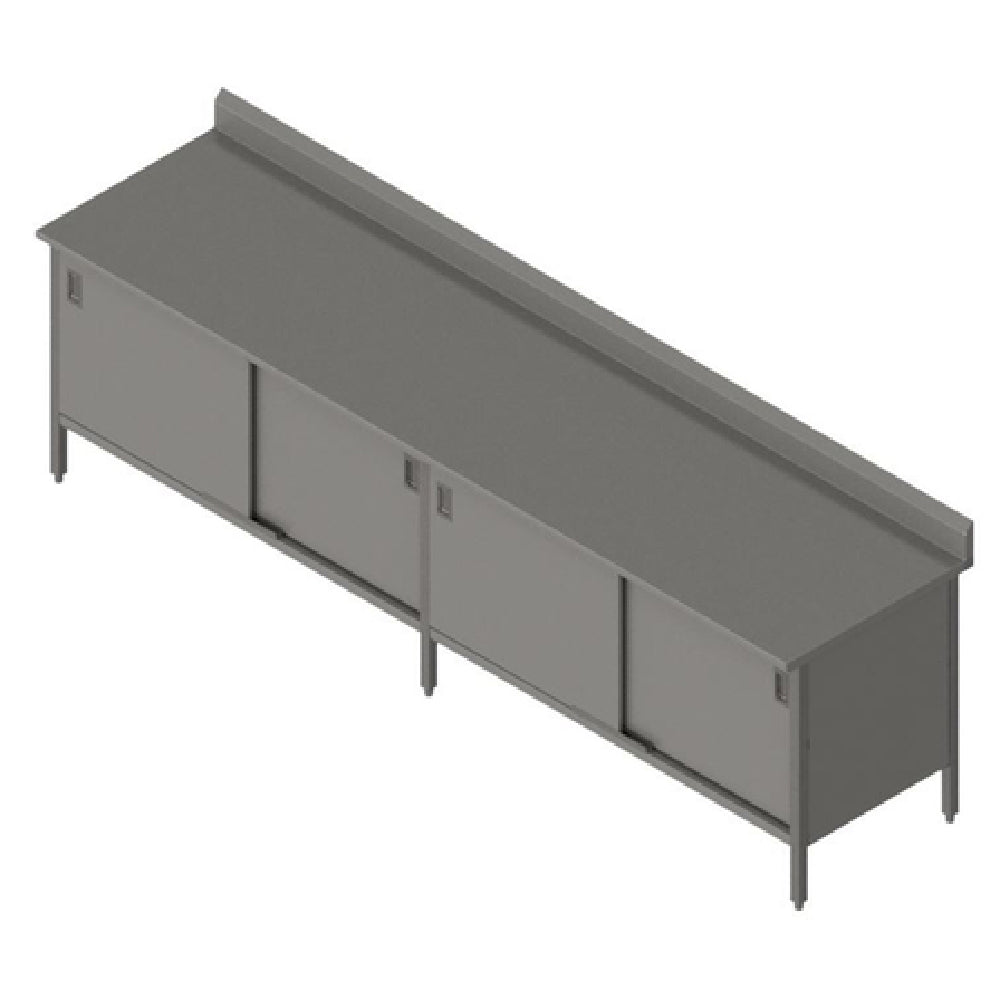 The John Boos EBSS6R5-2484 Work Table Cabinet Base With Sliding Doors is a meticulously designed piece, measuring 84 inches in width and 24 inches in depth, ideally suited for professional kitchen environments. Featuring a 16-gauge, 300-series stainless steel top, this work table is accompanied by a practical 5-inch backsplash to help maintain cleanliness and order. The Stallion Safety Edge front provides an added level of safety, while the 90-degree turndown on the sides enhances its sleek profile. Beneath the robust stainless steel top lies a durable stainless steel base and an undershelf, providing ample storage space. The sliding doors facilitate smooth access to stored items, optimizing efficiency in busy kitchen settings. The table's 1-inch adjustable bullet feet ensure stability on uneven surfaces, and the all-welded setup underscores its structural integrity and longevity. NSF certification assures compliance with strict health and safety standards, making this work table a reliable choice for a variety of food service applications, from bustling restaurant kitchens to catering operations. The John Boos EBSS6R5-2484 combines superior materials with a thoughtful design, meeting the diverse demands of culinary professionals who value durability and functionality.