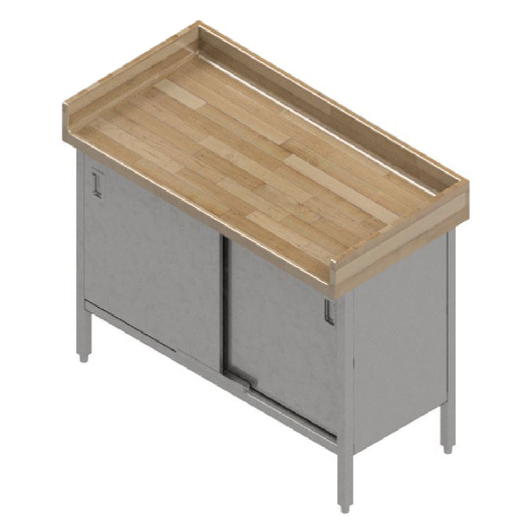 The John Boos EBSW7R43-3060 Work Table Cabinet Base With Sliding Doors is an expertly crafted work table designed to meet the varied needs of professional kitchens, restaurants, and food preparation facilities. Measuring 60"W x 30"D x 40-1/2"H overall, this work table provides ample workspace while maximizing organizational efficiency with its cabinet base featuring sliding doors. The 1-3/4" thick edge grain top is made from laminated Northern Hard Rock Maple, renowned for its durability and resistance to wear, with a 4" coved riser on the back and both ends to prevent spills and debris from falling off. The table's robust construction is further enhanced with a stainless steel base and undershelf, offering additional storage and easy-to-clean surfaces. Equipped with 1" adjustable bullet feet, the table ensures stability on uneven floors. The all-welded set-up guarantees long-lasting use and structural integrity, while the NSF certification underscores its compliance with high sanitation standards. This work table is engineered for efficiency and practicality, making it a valuable addition to various segment markets within the food service industry, from bustling commercial kitchens to efficient home culinary environments.