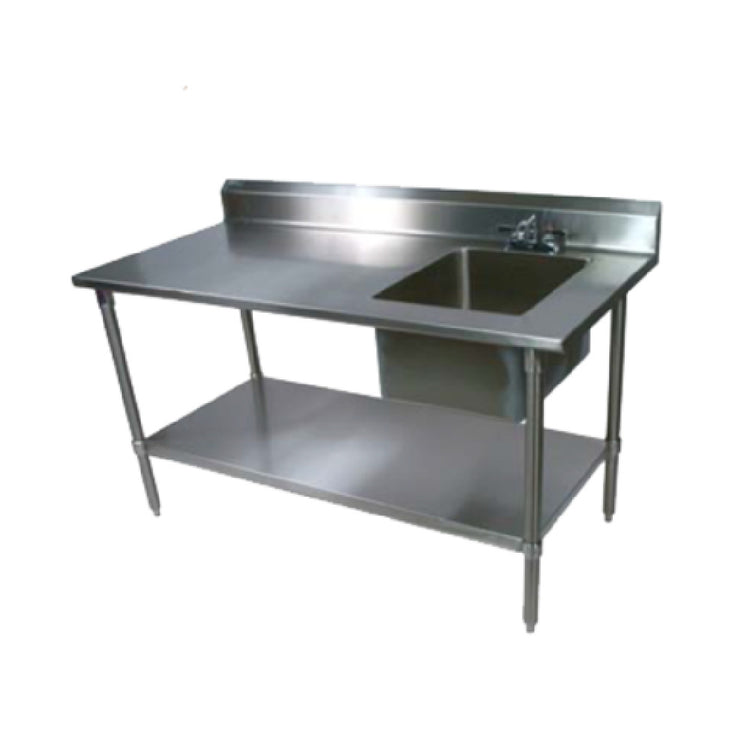 The John Boos EPT8R5-3060SSK-R Work Table With Prep Sink - 60"W x 30"D x 40-3/4"H overall size - is a versatile piece tailored for culinary professionals seeking efficiency and durability. Constructed from 18/300 stainless steel, this work table exemplifies robustness and longevity, ideal for various industrial kitchens. It features a 16"W x 20" front-to-back x 10" deep sink bowl positioned on the right, accommodating a range of prep tasks. The table is designed with a 5"H backsplash and a set of deck mount faucet holes 4" O.C., though a faucet is not included. Its stainless steel legs and adjustable undershelf enhance storage flexibility, while the 1" stainless steel adjustable bullet feet ensure stability across diverse kitchen environments. This work table is KD, facilitating easy assembly and transport, and is compliant with NSF and CSA-Sanitation standards, ensuring it meets public health and safety requirements. The John Boos EPT8R5-3060SSK-R is an invaluable addition to restaurants, catering services, and other food service operations, offering a blend of practicality and high-grade materials to support a wide range of kitchen activities efficiently.
