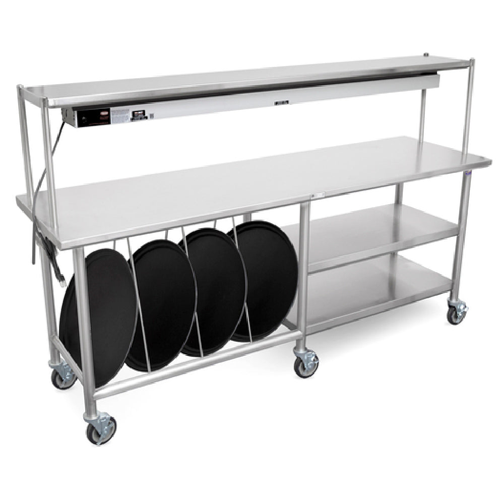 The John Boos ET6-2484SSW Expediting Table is expertly crafted for commercial kitchens, providing a highly functional and durable workspace. With dimensions of 84"W x 24"D, this table features a robust 16/300 stainless steel flat top, ideal for food preparation and expediting. The Stallion Safety Edge on the front and back ensures a smooth and safe working edge, while the 90-degree turndown on sides further enhances its sleek design. This expediting table comes with an 84"W x 12"D overshelf supported by 1" posts, offering additional storage space for kitchen essentials. An integrated Hatco Glo-Ray Infrared Foodwarmer, measuring 72"W, provides high-wattage heat with a built-in toggle switch, operating at 120v/60/1-ph and generating 1725 watts, making it perfect for keeping food warm during service. The all-welded construction, along with stainless steel legs and a welded undershelf, ensures long-lasting durability and stability. Equipped with 5" locking casters, this table offers mobility and secure placement, adapting to the dynamic needs of a fast-paced kitchen environment. The John Boos ET6-2484SSW is an excellent choice for restaurants and catering facilities seeking reliable and efficient equipment to enhance their food service operations.