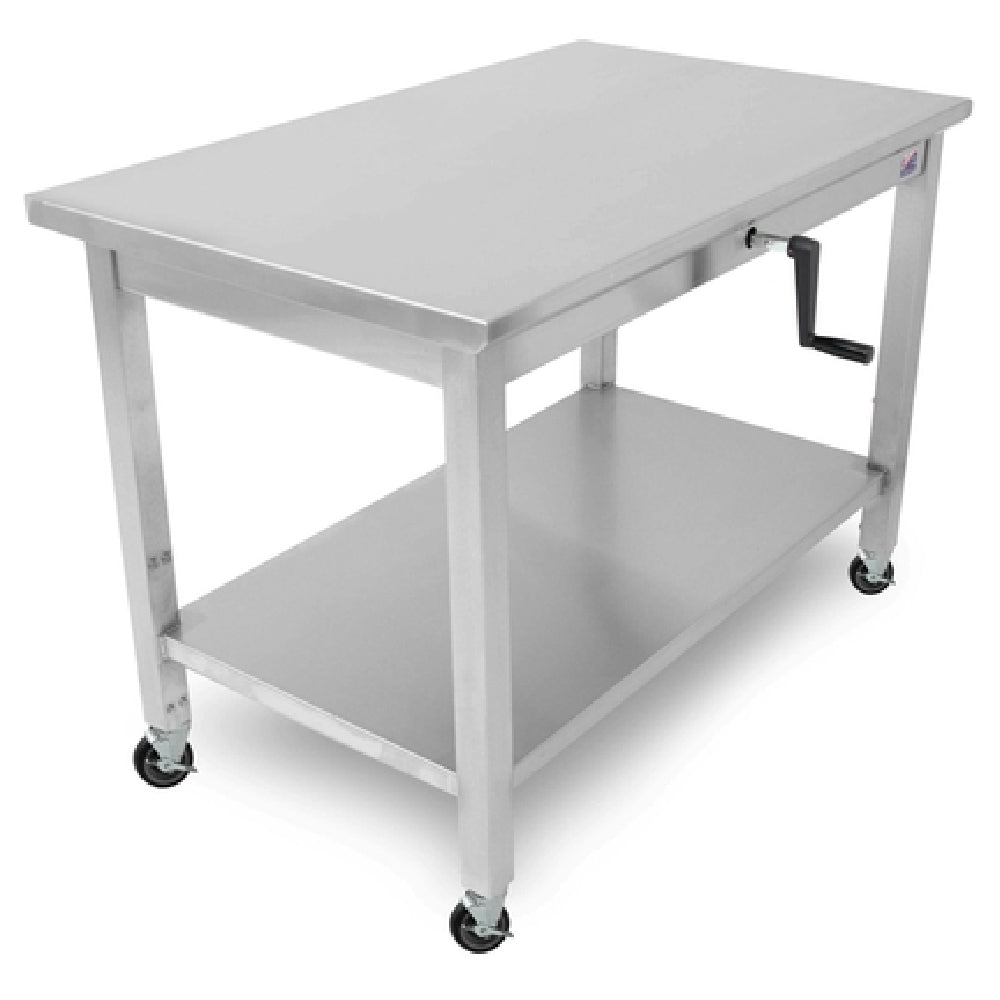 The John Boos LT6-3072SSW-C ADA Work Table With Adjustable Height 72"W X 30"D is a versatile and robust solution for various professional environments requiring flexibility and durability. This work table features a 72-inch wide and 30-inch deep 16/300 series stainless steel top, ensuring a durable and long-lasting surface that is ideal for industrial settings. It includes an 18-gauge fixed stainless steel undershelf, providing additional storage space for essentials. The table's hydraulic lift system allows for height adjustments ranging from 32 inches to 40 inches, facilitated by an 8-inch stroke lift system cylinder and a foldable hand crank, making it compliant with ADA standards. This adjustability makes the table suitable for diverse user needs and operational requirements. Constructed with stainless steel legs and equipped with 5-inch locking casters, it provides excellent stability and mobility within the workspace. The John Boos LT6-3072SSW-C work table is an ideal choice for laboratories, commercial kitchens, and manufacturing settings, offering both adaptability and strength to support various tasks and workflows.