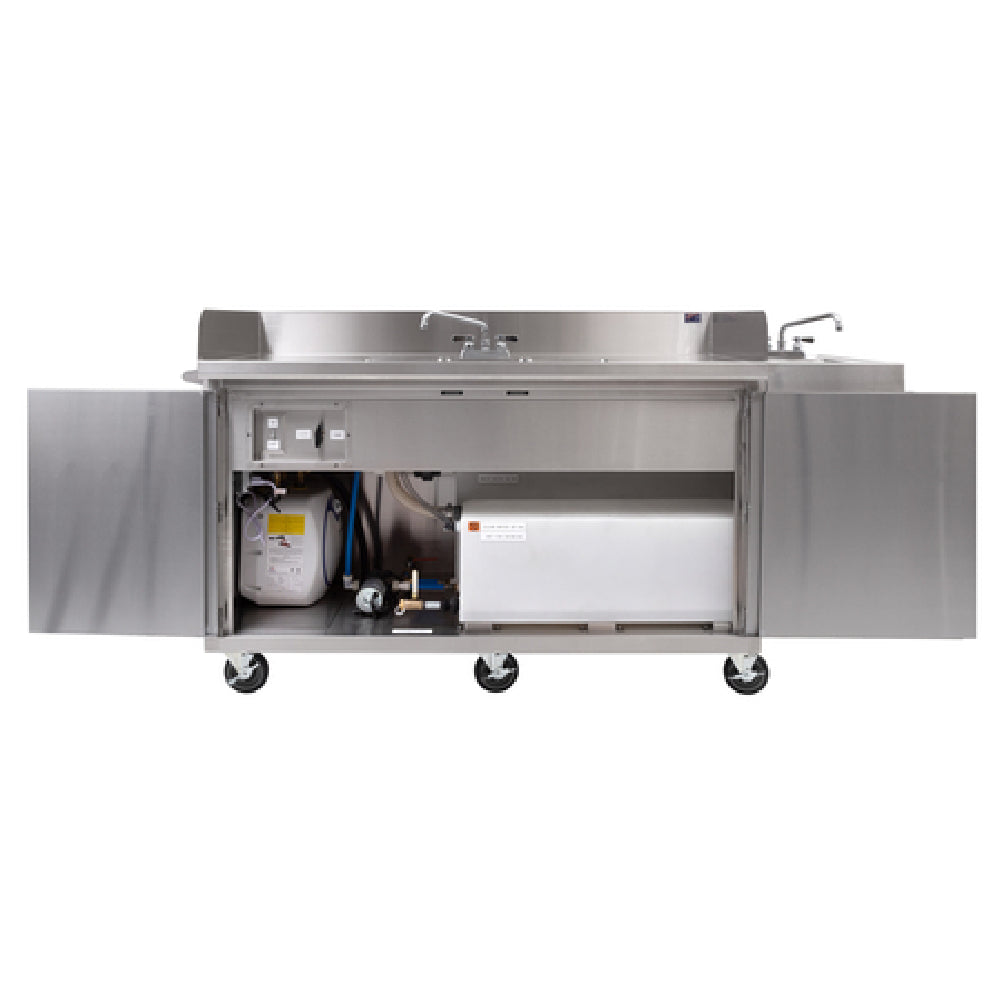 The John Boos MCS3-1014-HS Mobile Hand Sink 3-compartment With Hand Sink Self Contained is an essential solution for various industries requiring mobile sanitation. This unit measures 75 inches wide, 28 inches deep, and 43-13/16 inches high, featuring a 16/300 stainless steel top for robust durability. It includes three 10-inch wide, 14-inch front-to-back, and 5-inch deep compartments, complemented by a marine edge and 5-inch rear riser with side splashes. Additionally, it offers a separate 10-inch wide, 14-inch front-to-back, 5-inch deep hand sink equipped with two 10-inch swing spout faucets set on 4-inch centers for easy and efficient usage. Designed for flexibility, the unit comes with a 2-1/2 gallon water heater, and options for city water connections or stationary use with a 20-gallon fresh water tank and a 30-gallon waste water tank. The cabinet is constructed of 18-gauge stainless steel, features two hinged doors with magnetic catches, and is mounted on 5-inch locking casters for mobility. The product is powered by 120v/60/1-ph, 15.0 amps, with a GFI outlet and a 6-foot cord, making it a comprehensive and versatile sanitation solution for any mobile operation, particularly in places like Effingham.