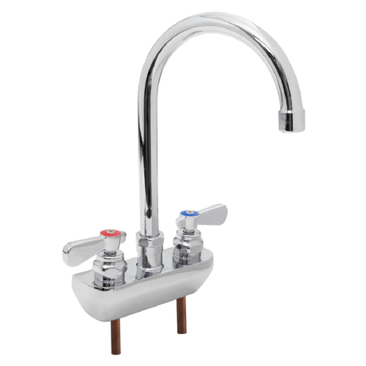 The John Boos PBF-4SM2-5GLF Heavy Duty Faucet is a meticulously designed fixture perfect for professional environments that demand durability and precision. Featuring a shallow splash mount design, this faucet is equipped with a 6-inch gooseneck spout offering flexibility and ease of use. Its 4-inch centers are designed for stability and efficient installation. The faucet is crafted with 1/4 turn ceramic cartridges ensuring smooth operation and longevity while the color-coded hot and cold indicators provide intuitive usability. An integral check valve is included to prevent backflow, enhancing safety and functionality. The faucet is finished in chrome, combining aesthetic appeal with resilience. It supports a 1/2-inch NPT connection, making it a versatile choice for various installation setups. Its compliance with NSF, cCSAus, and ADA standards speaks to its quality and universal accessibility. Being lead-free, the faucet aligns with health and safety regulations, making it an ideal choice for commercial kitchens, food service establishments, and other high-demand environments where reliability and compliance are critical. This faucet stands out in the industry for its solid construction and thoughtful features, highlighting its value across different market segments.