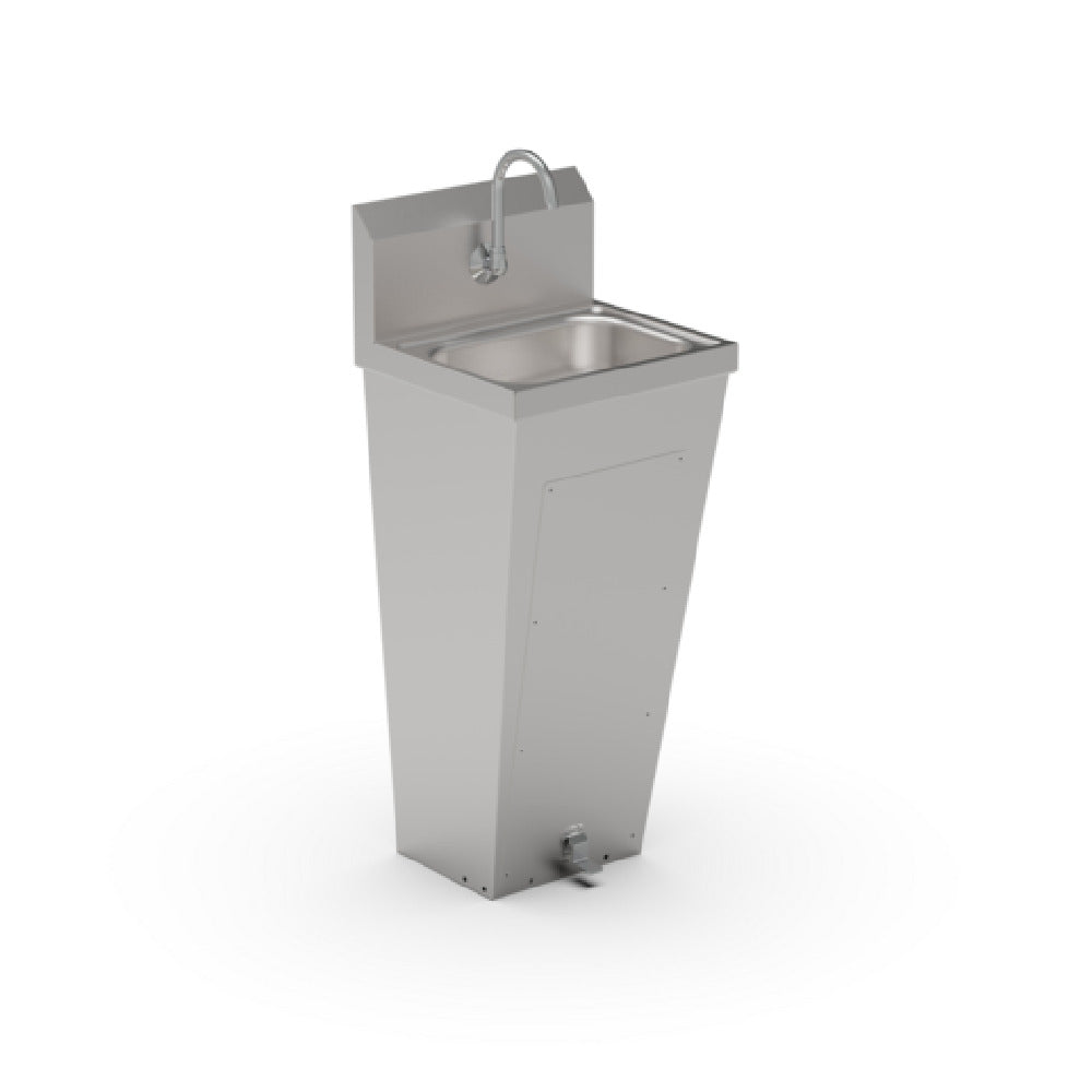 The John Boos PBHS-F-1410-FV1-T Pro-Bowl Hand Sink is a specialized floor-mounted unit with a tapered pedestal design, tailored for environments requiring compact and efficient handwashing solutions. Its bowl measures 14 inches in width, 10 inches in depth from front to back, and has a depth of 5 inches, providing ample space for handwashing while conserving valuable space. The sink is equipped with a 9-3/4 inch high backsplash, helping to protect surrounding areas from water splashes. Featuring a single centered splash mount faucet hole, it accommodates a 3-1/2 inch gooseneck spout, which is ideal for both style and functionality. The sink includes a 2-inch drain opening with a basket drain, ensuring effective water drainage. This model comes with a single foot valve (PBF-FV1-SM-35GLF), allowing for hands-free operation, which is highly desired in high hygiene standards settings. Crafted from 18/300 stainless steel, this hand sink combines durability with ease of maintenance. Certified by NSF, this product meets rigorous public health and safety standards, making it a reliable choice for a variety of industries such as food service, healthcare, and industrial settings where both cleanliness and durability are paramount.