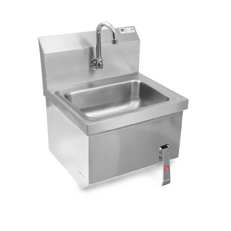 The John Boos PBHS-W-1410-KV1APN Pro-Bowl Hand Sink Wall Mount With Apron is designed for professional environments that demand high standards of hygiene and durability. This unit features a 14-inch wide by 10-inch front-to-back by 5-inch deep bowl, providing ample space for hand washing tasks. The hand sink is equipped with a centered splash mount faucet hole and includes a gooseneck spout, which ensures efficient water flow. It also incorporates a single knee valve, allowing for hands-free operation, a key feature for maintaining sanitation. The sink includes a 2-inch drain opening and comes with a basket drain and wall brackets for easy installation. Constructed entirely from stainless steel, it guarantees longevity and resistance to corrosion, making it ideal for use in busy commercial settings such as restaurants, hospitals, and food processing facilities. Recognized for its compliance with NSF and CSA-Sanitation standards, the John Boos hand sink underscores its commitment to meeting safety and sanitation requirements. This model is particularly suitable for industries where hygiene is paramount, providing a reliable and efficient hand-washing solution with the added convenience of included knee valve faucet and apron.