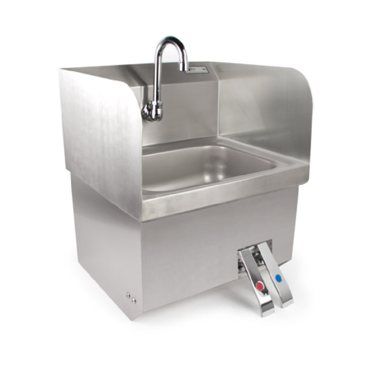 The John Boos PBHS-W-1410-KV2APN-SS Pro-Bowl Hand Sink is an expertly designed wall-mounted unit that promises both durability and functionality. With dimensions of 14 inches in width, 10 inches front-to-back, and a 5-inch deep bowl, this sink is compact yet efficient, making it ideal for high-demand environments. It features a centered splash mount faucet hole equipped with a gooseneck spout, providing ease of use and cleanliness. The sink includes double knee valves for hands-free operation, enhancing hygiene standards. A 2-inch drain opening, complete with basket drains and wall brackets, ensures efficient water management. The inclusion of left and right side splashes further minimizes water spillage. Crafted entirely from stainless steel, the sink is robust and easy to maintain, meeting NSF and CSA-Sanitation standards. This model is particularly suited for industries that prioritize cleanliness and durability, such as healthcare, food service, and laboratories, where space efficiency and superior sanitation are paramount. The apron design adds an extra layer of protection and style, making the John Boos Pro-Bowl Hand Sink a smart investment for those needing a reliable, high-quality handwashing station.