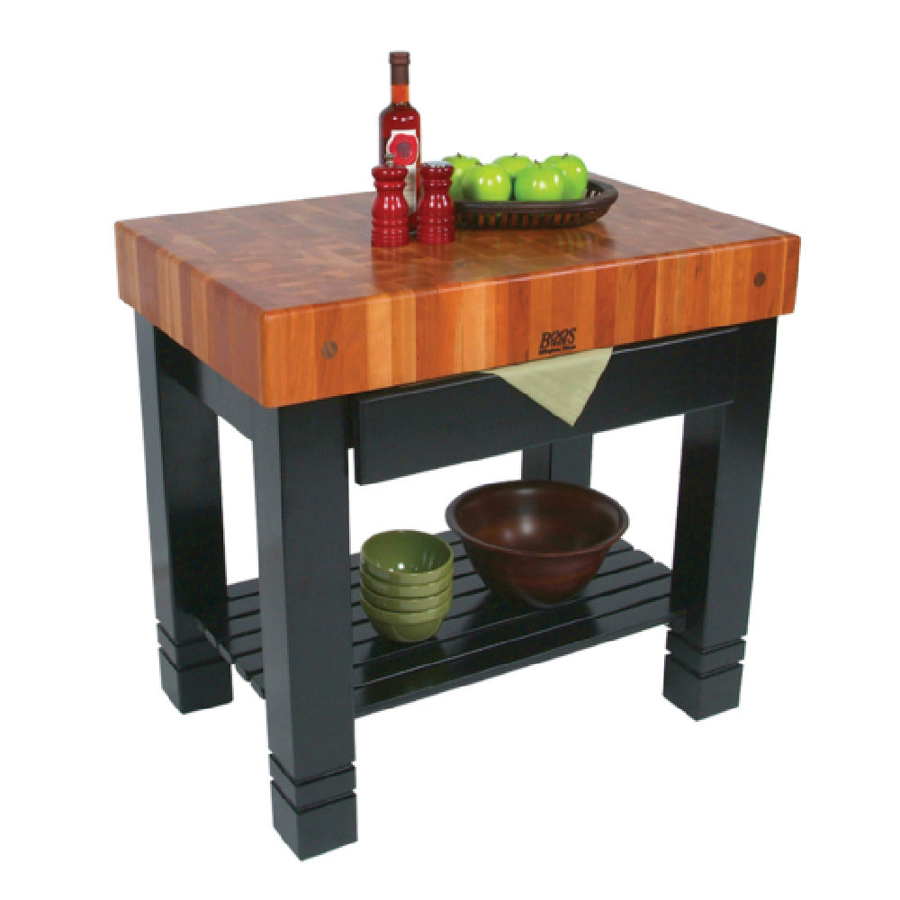The John Boos RN-BF Rouge Et Noir Bloc De Foyer is a meticulously crafted kitchen centerpiece with an overall size of 36"W x 24"D x 34"H. This piece features a substantial 5" end grain top made from American Cherry, finished with oil to enhance its natural beauty and durability. The block includes an apron drawer, providing convenient storage for kitchen essentials, and a slatted lower shelf that adds both functionality and style, perfect for storing additional items or showcasing decorative pieces. Its base is painted in a sleek black, offering a striking contrast to the rich cherry top. This product's design combines practicality with aesthetic appeal, making it a versatile choice for a variety of kitchen settings. Whether in a professional culinary environment or a home kitchen, the John Boos RN-BF adds both utility and elegance, catering to different market segments within the culinary industry. Its robust construction and thoughtful design details ensure it meets the demands of both heavy-use commercial settings and sophisticated residential spaces, highlighting its unique value proposition as a functional and stylish kitchen furniture piece.