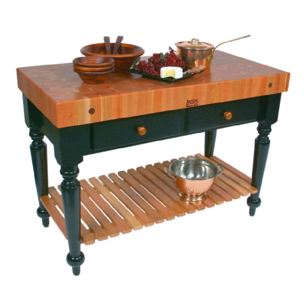 The John Boos RN-LR04-SSL Rouge Et Noir Le Rustica Table is a meticulously designed piece characterized by its classic yet functional craftsmanship, suitable for various market segments. This table boasts an overall size of 30 inches in width, 24 inches in depth, and 34-1/2 inches in height, making it an ideal fit for both compact and spacious environments. Its 4-inch thick end grain top is crafted from premium American Cherry, finished with oil to highlight its natural beauty and durability. The table includes a dovetailed drawer, providing practical storage solutions, while the American Cherry slatted undershelf offers additional space with structural integrity. Supported by tapered legs, the table is designed for stability, and its black-painted base adds a touch of sophistication. The knockdown (KD) design ensures ease of assembly and transportation. This table serves as a versatile workstation for culinary professionals, a stylish piece for home kitchens, or an elegant display in gourmet settings. The combination of high-quality materials and thoughtful design makes the John Boos RN-LR04-SSL Rouge Et Noir Le Rustica Table a valuable investment for those seeking both functionality and aesthetic appeal in their furnishings.