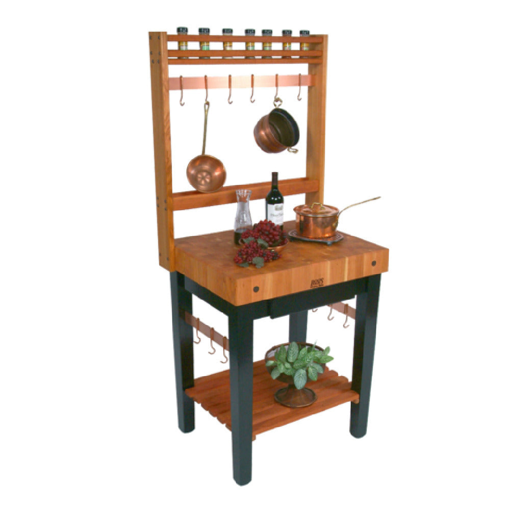 The John Boos RN-PPB3624 Rouge Et Noir Pro Prep Bloc Work Table is a meticulously crafted piece, ideally suited for both professional and home culinary environments. Measuring 36 inches in width, 24 inches in depth, and 36 inches in height, this work table is designed to provide ample space for food prep activities. A standout feature is its 4-inch thick end grain top, made from high-quality American Cherry, which not only ensures durability but also offers a sophisticated aesthetic with an oil finish that highlights the wood's natural beauty. The table includes an American Cherry slatted shelf, providing additional storage space that is both functional and visually appealing. Enhancing its distinctive style, flat copper tie bars integrate seamlessly with the six copper pot hooks, allowing for convenient utensil storage and accessibility. The base, painted in a striking black caviar finish, completes the table’s elegant and modern design. This work table is particularly valuable for chefs and cooking enthusiasts who appreciate a blend of functionality and high-end craftsmanship, making it a versatile asset for kitchens that demand both performance and style.