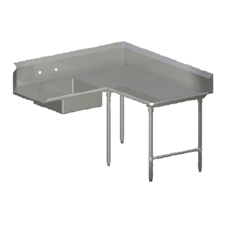 The John Boos SDT4-K60120SBK-R Pro-Bowl Soiled Dishtable is a specialized kitchen fixture designed for efficient right-to-left operation, ideal for commercial settings looking to streamline their dishwashing process. This L-shaped corner dishtable boasts a substantial 60" machine-to-corner and extends 120" from the corner to the end, providing ample workspace. It features a single 20"W x 20" front-to-back x 8" deep pre-rinse sink bowl, perfect for handling soiled dishes before they enter the washing station. The unit is constructed with a 14/300 stainless steel top and reinforced by stainless steel legs and bracing, ensuring durability and longevity in high-use environments. For added functionality, it includes a 10"H boxed backsplash with a 45° top and a 2" return to prevent water spillage, along with one set of splash mount faucet holes with 8" centers. The 2-1/4"H rolled edge adds to its robust design, while the adjustable bullet feet allow for stable installation on uneven surfaces. NSF certification highlights its compliance with hygiene standards, making it a reliable choice for restaurants, cafeterias, and other food service operations seeking to enhance their kitchen workflow with quality and precision.